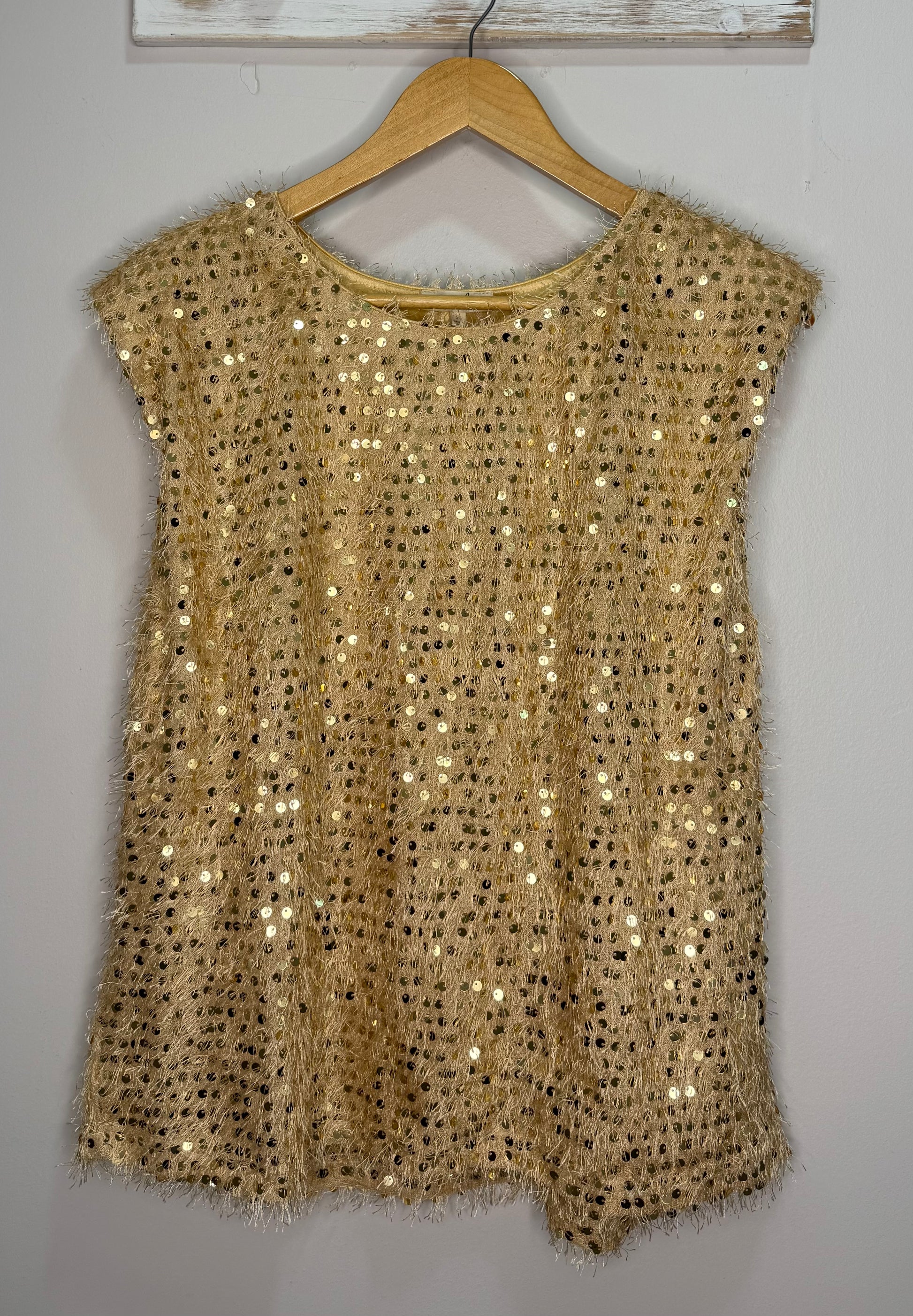 Sleeveless sequin top, crew neck and shoulder pads. Relaxed and slouchy fit. Sparkly all over. 100% Polyester.