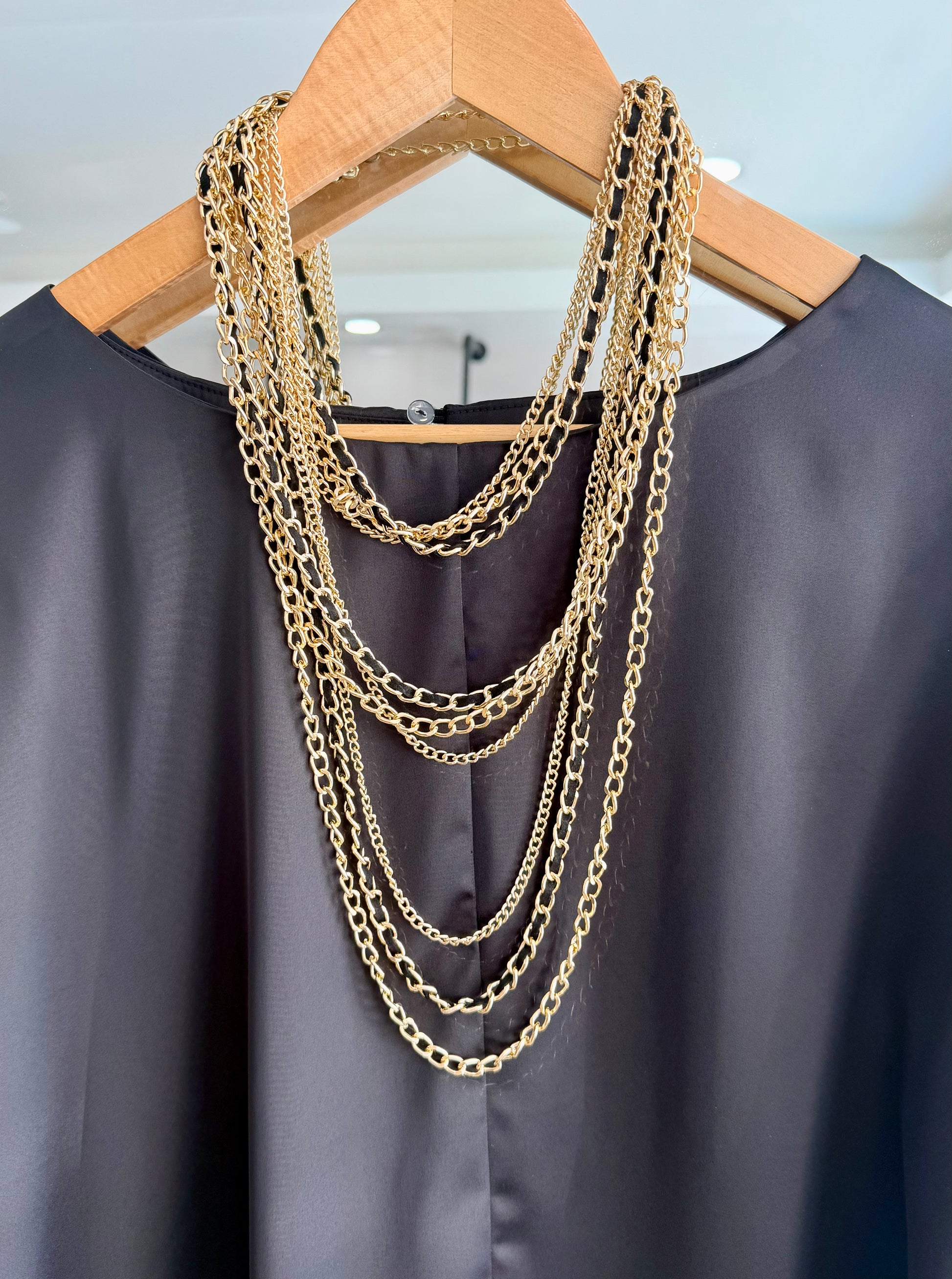 Black and gold multilayer necklace.