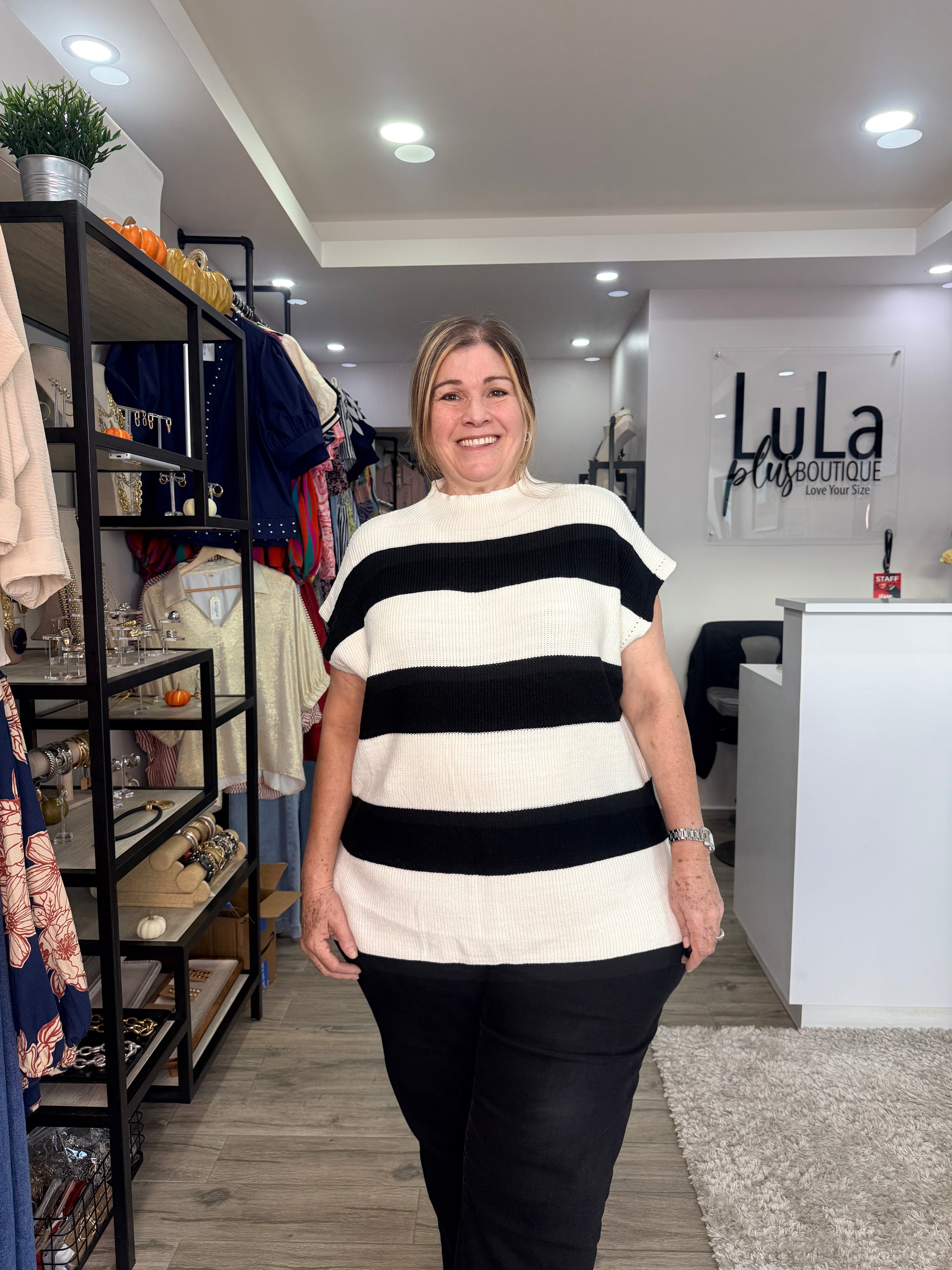 Lightweight striped print knit top with mock neck and slay sleeves. 100% Acrylic.