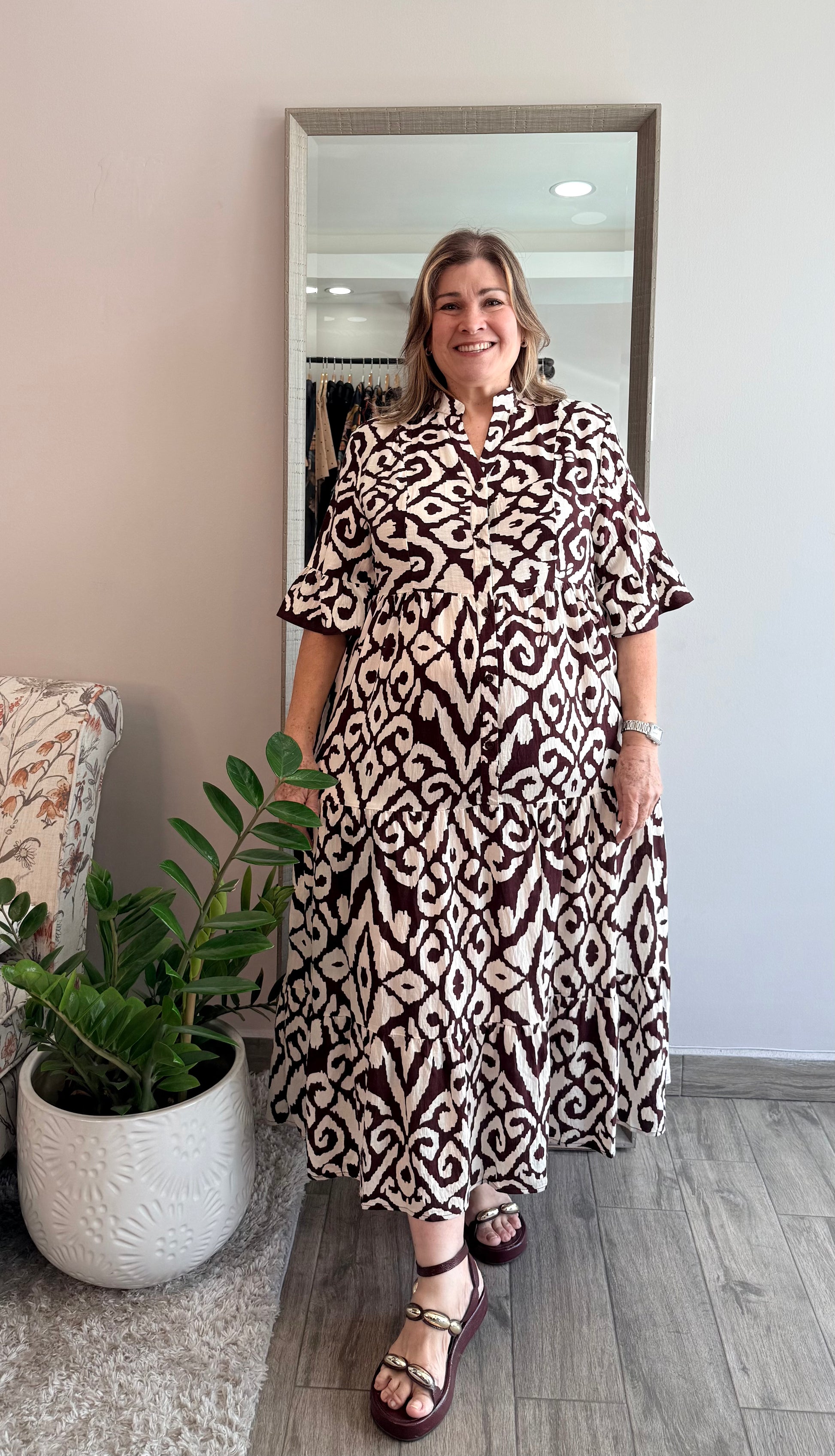 Chocolate brown and cream abstract print maxi dress with short sleeves and V neck.