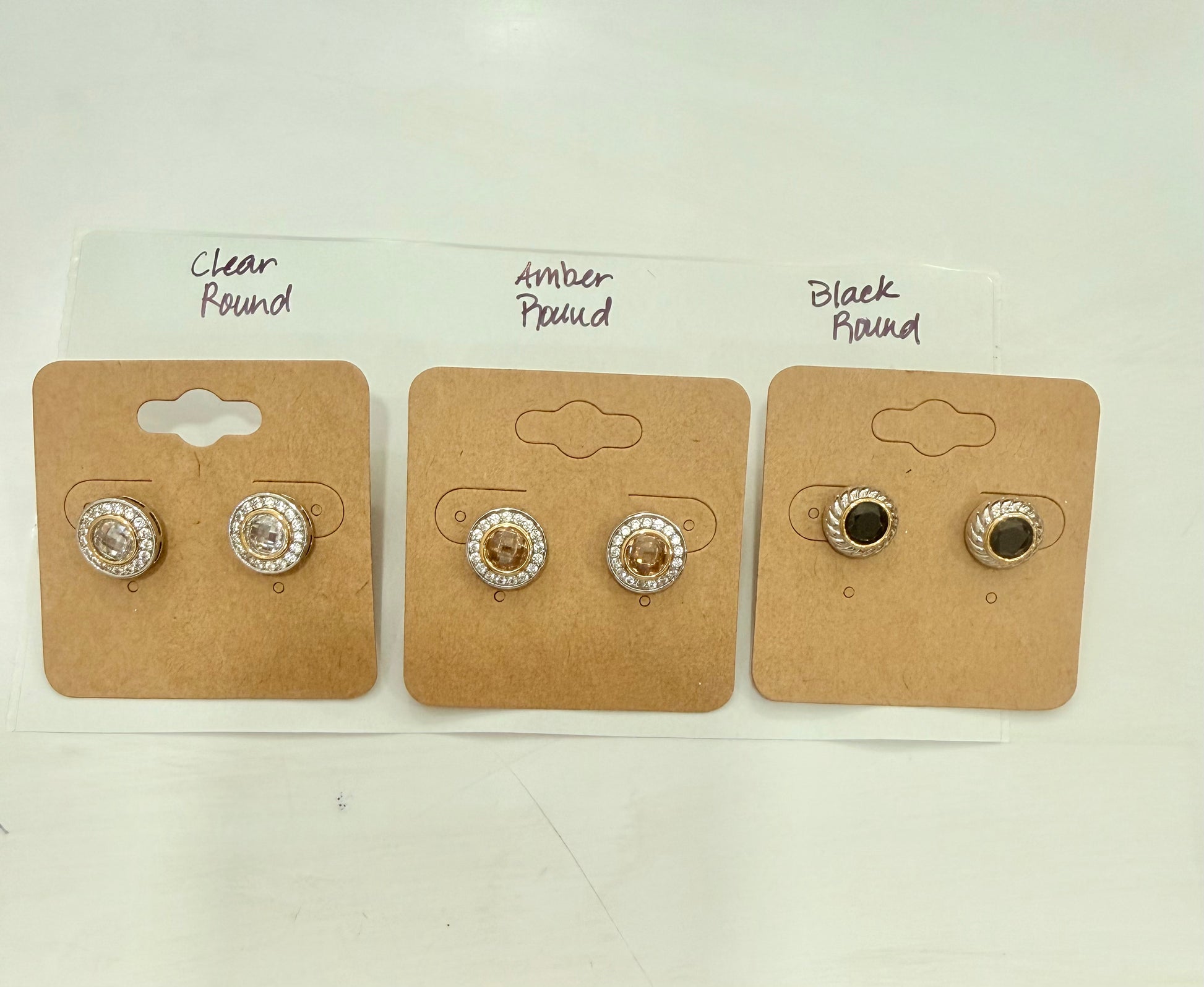- Round stud earring available amber, black and clear.