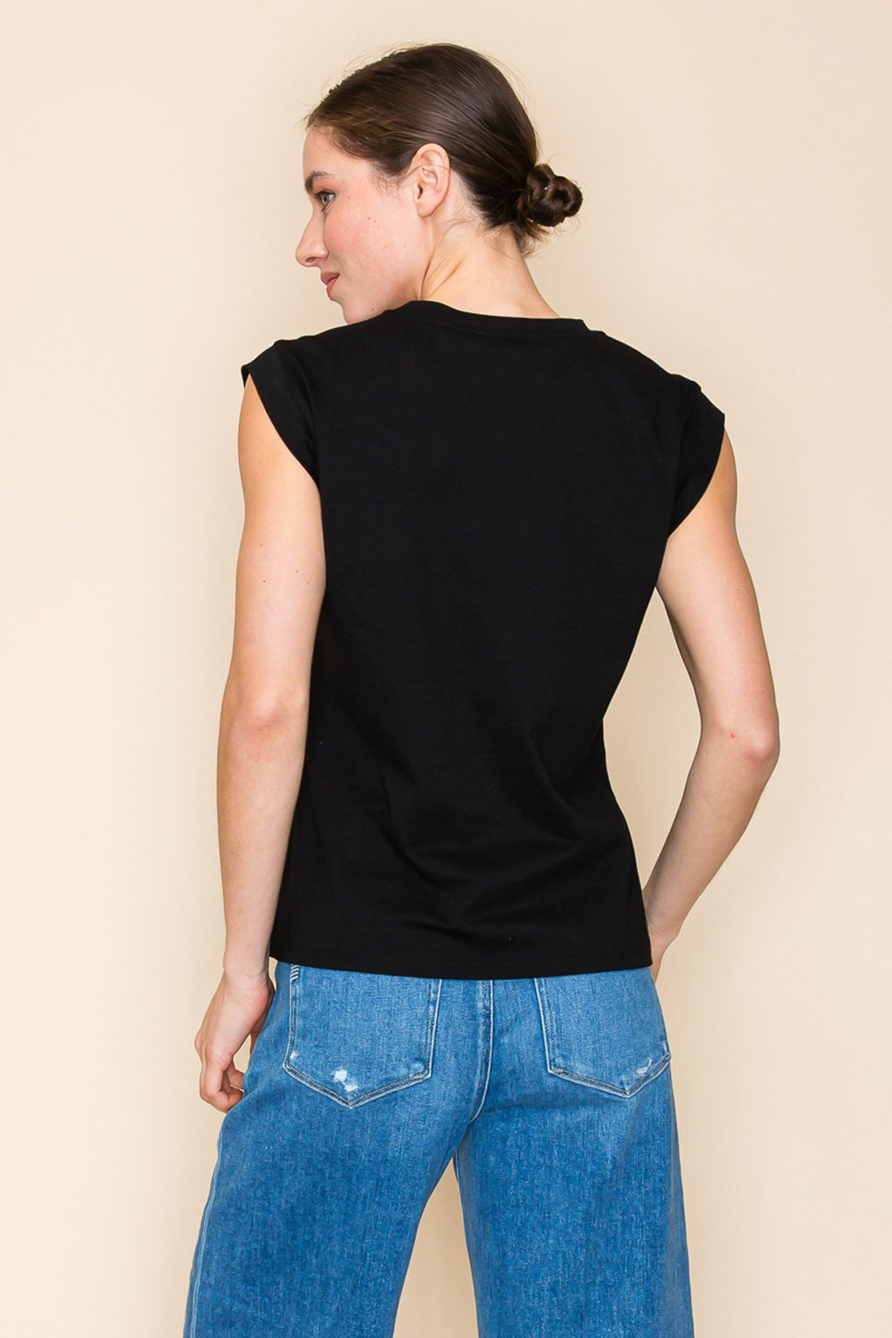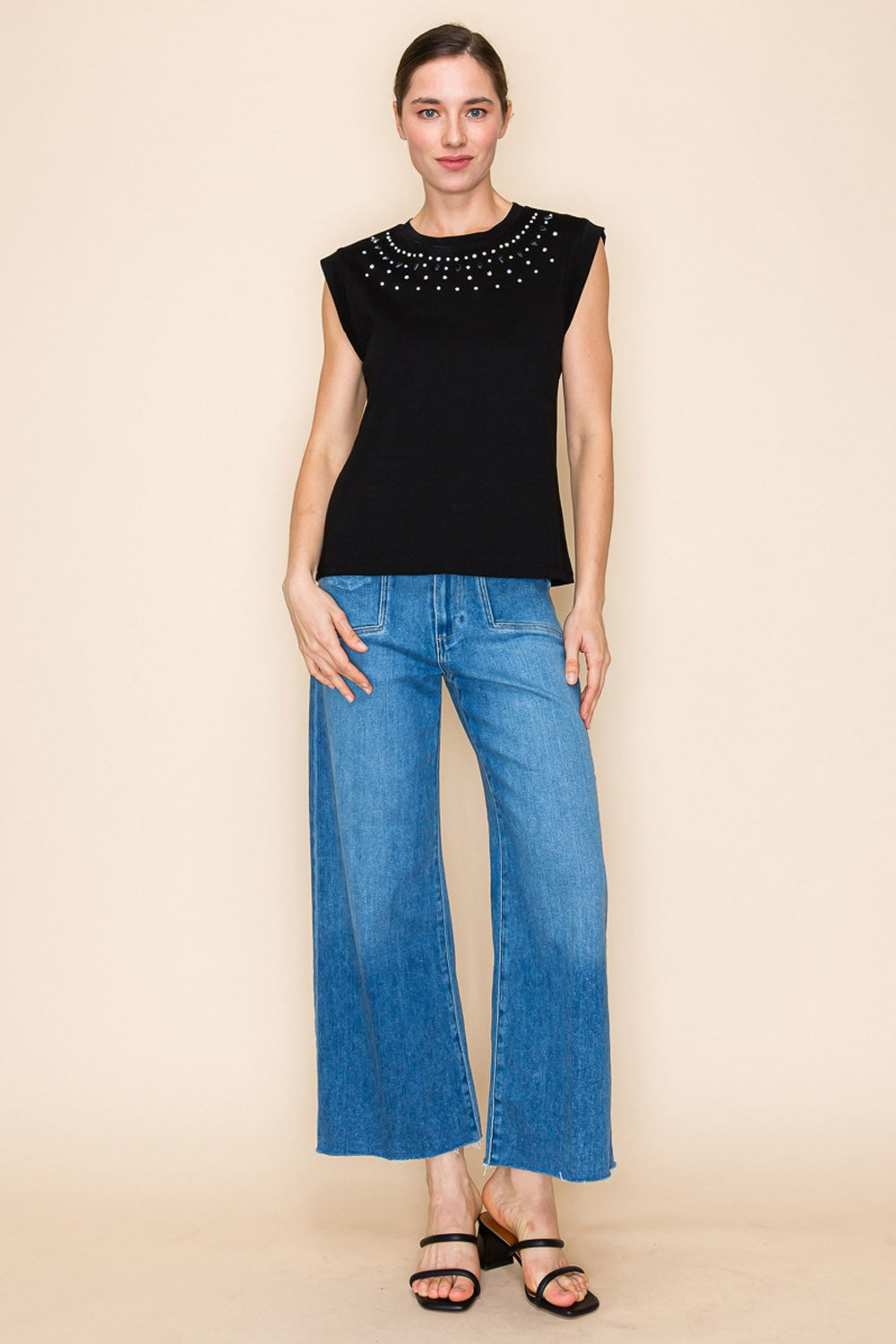 Sleeveless solid knit top with a round neck featuring a jewel yoke detail and a true-to-size fit. Fabric is a lightweight knit. 100% Cotton.