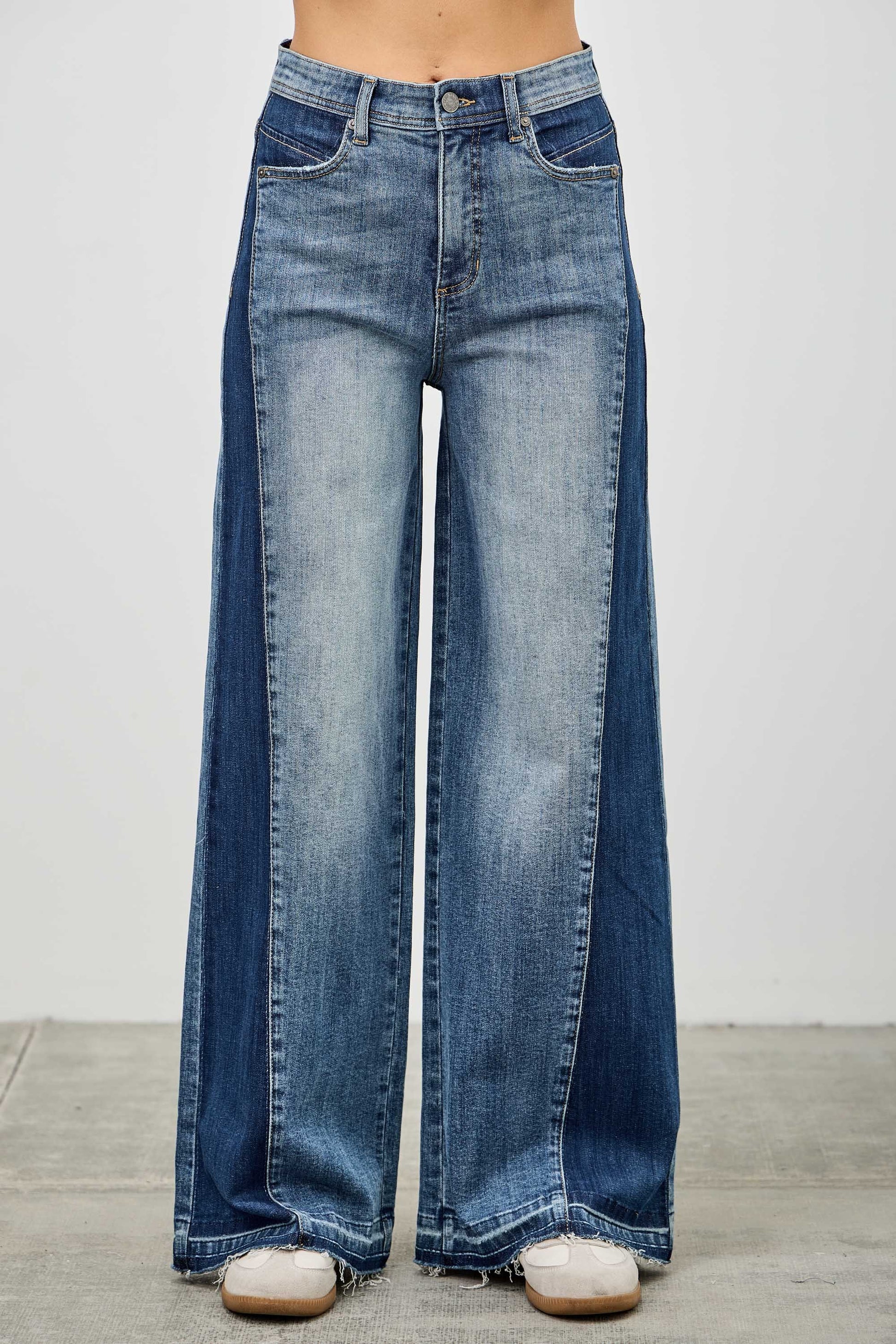 High waisted, medium wash, wide leg jeans with darker denim full length side patch and released hemline. 98% Cotton & 2% Spandex.