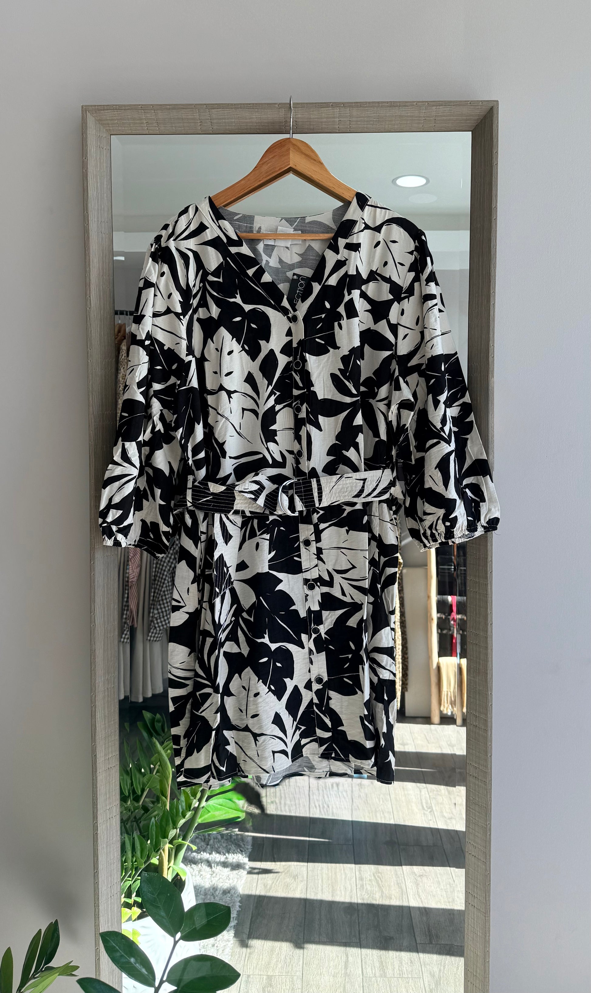 Off white and black print with elastic cuff 3/4 sleeves. Matching detachable belt included. 90% Rayon, 10% Nylon.