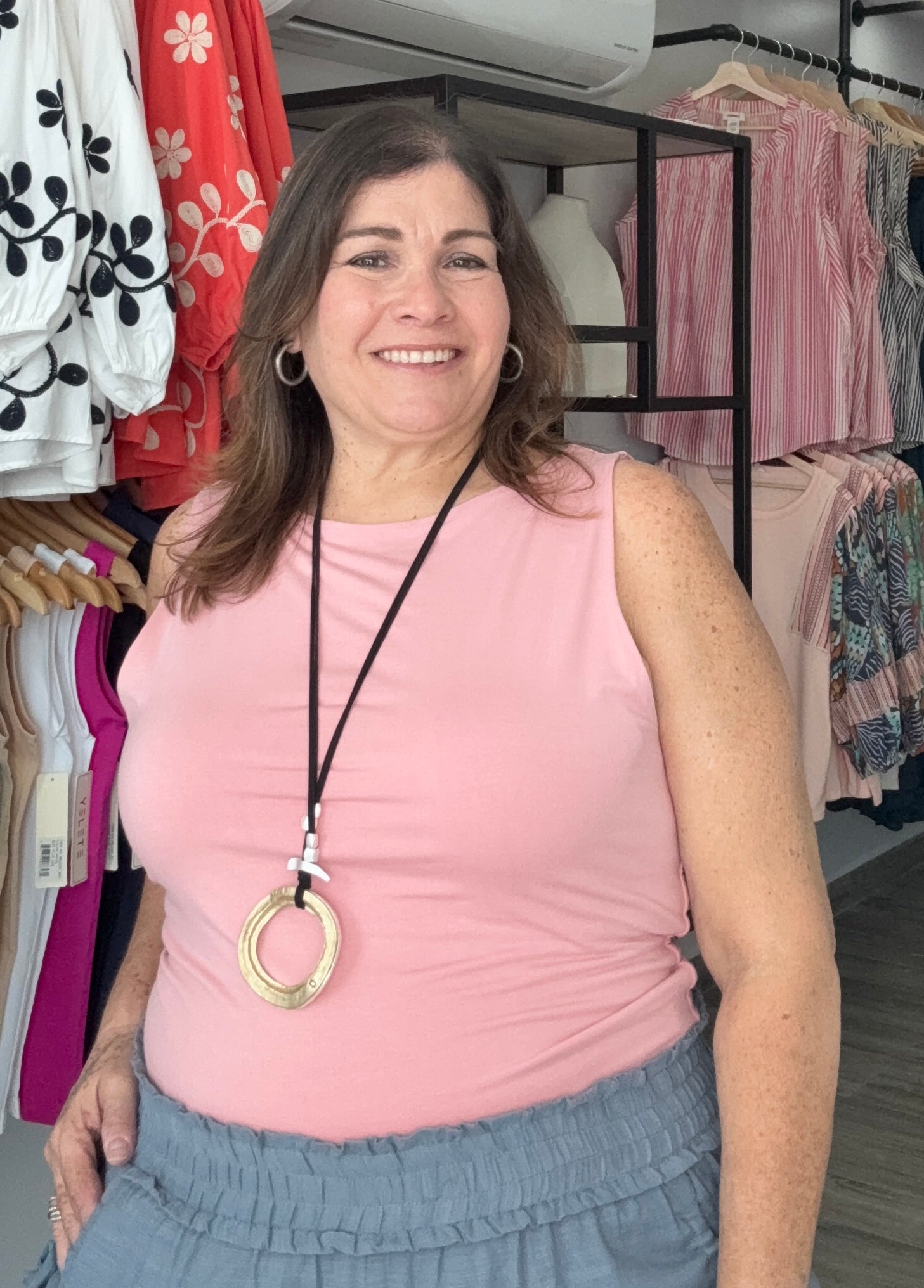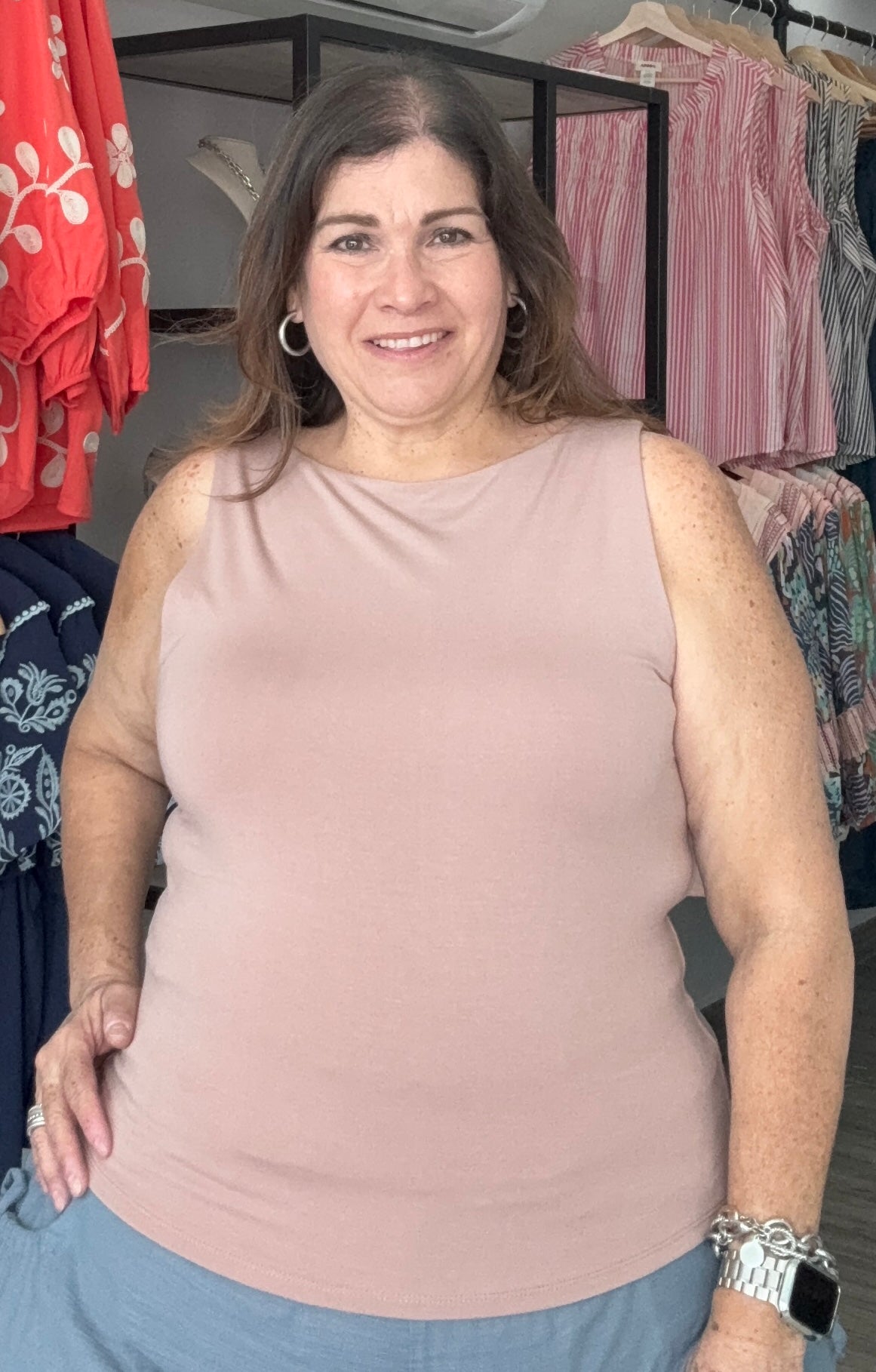 Basic double lined full length top with elegant boat neck. Jersey knit tank top. Fabric 95% rayon 5% spandex