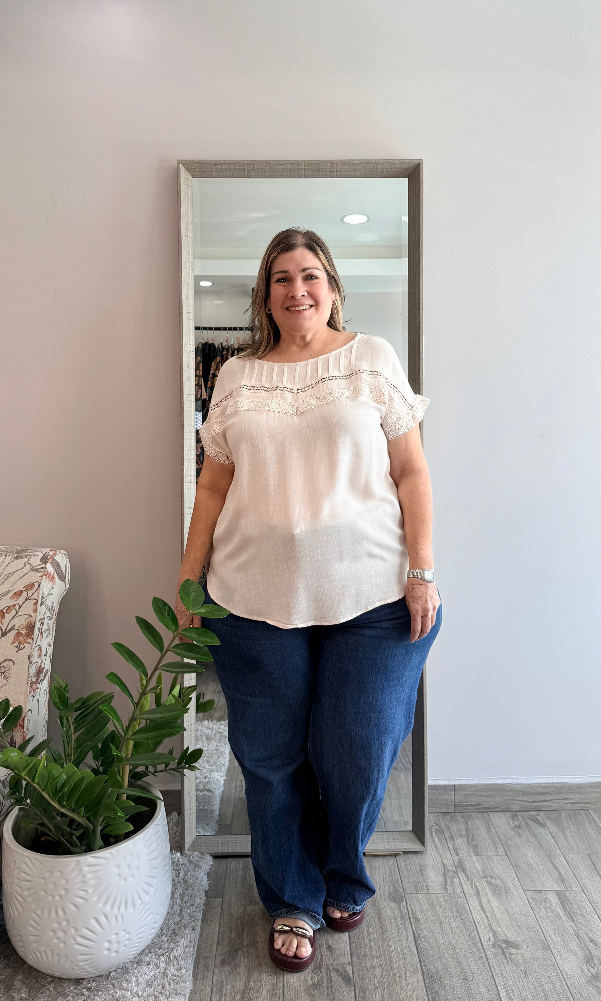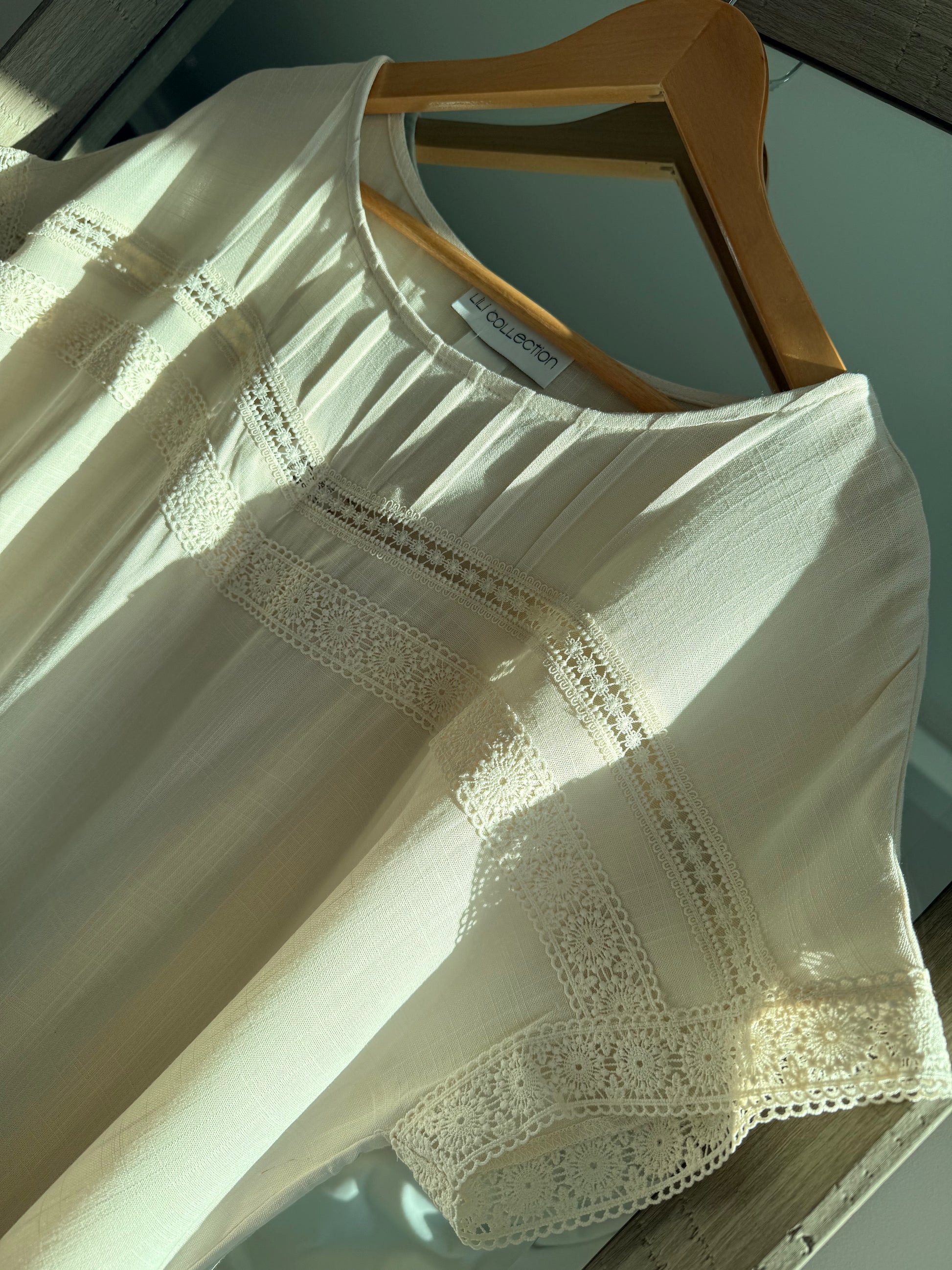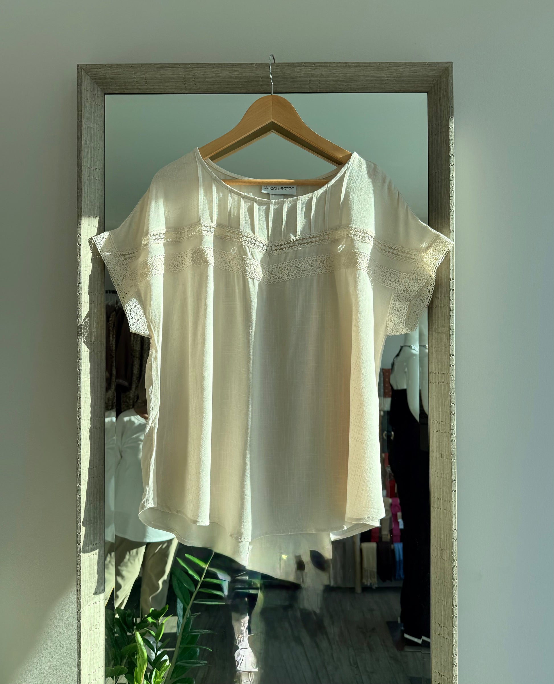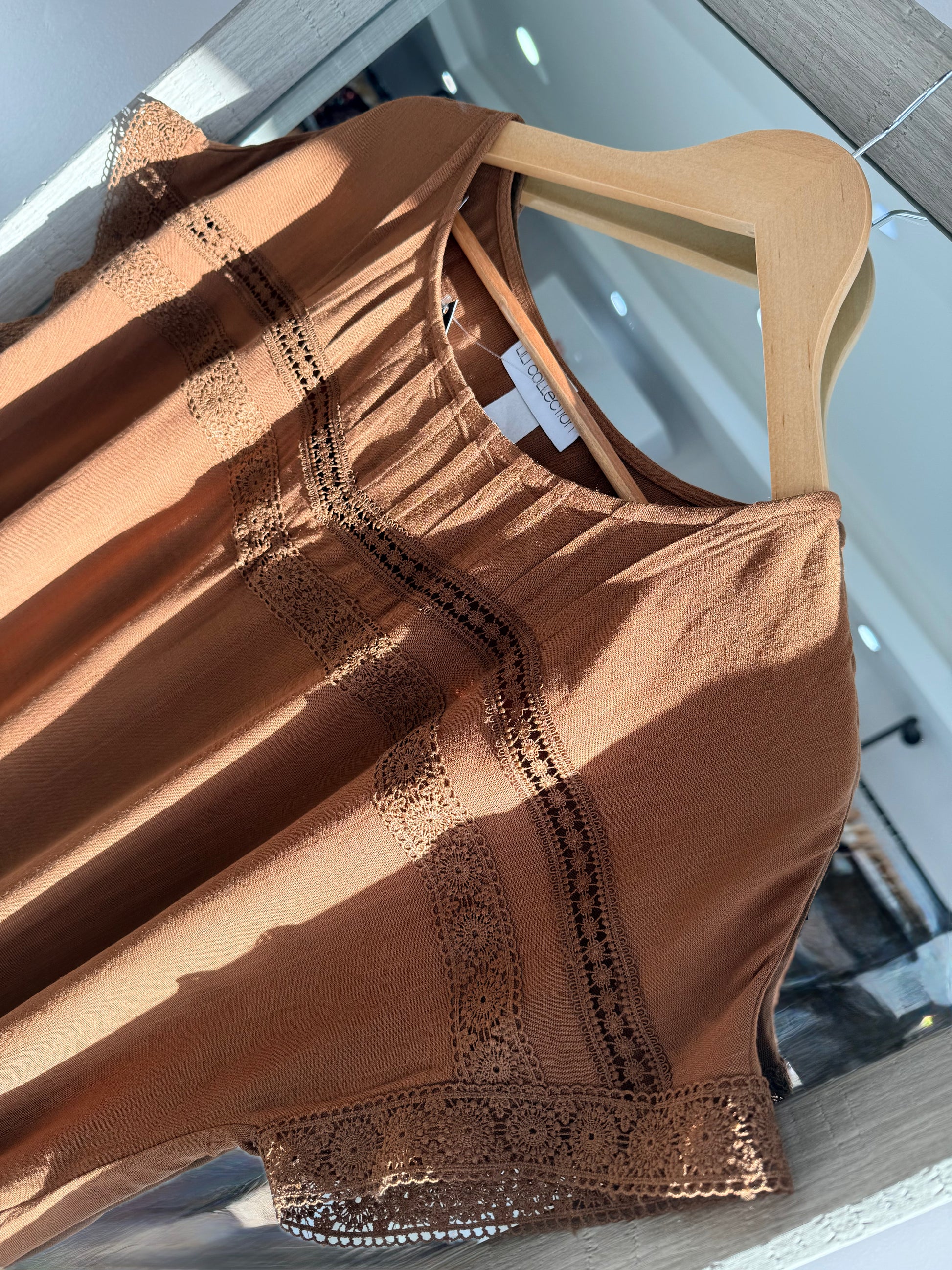 Beautiful detail short sleeve top, available in beige and brown. 100% Rayon.