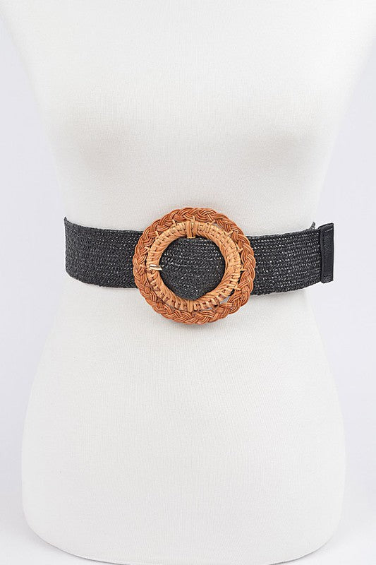 Beautiful black elastic straw belt with round bamboo buckle.