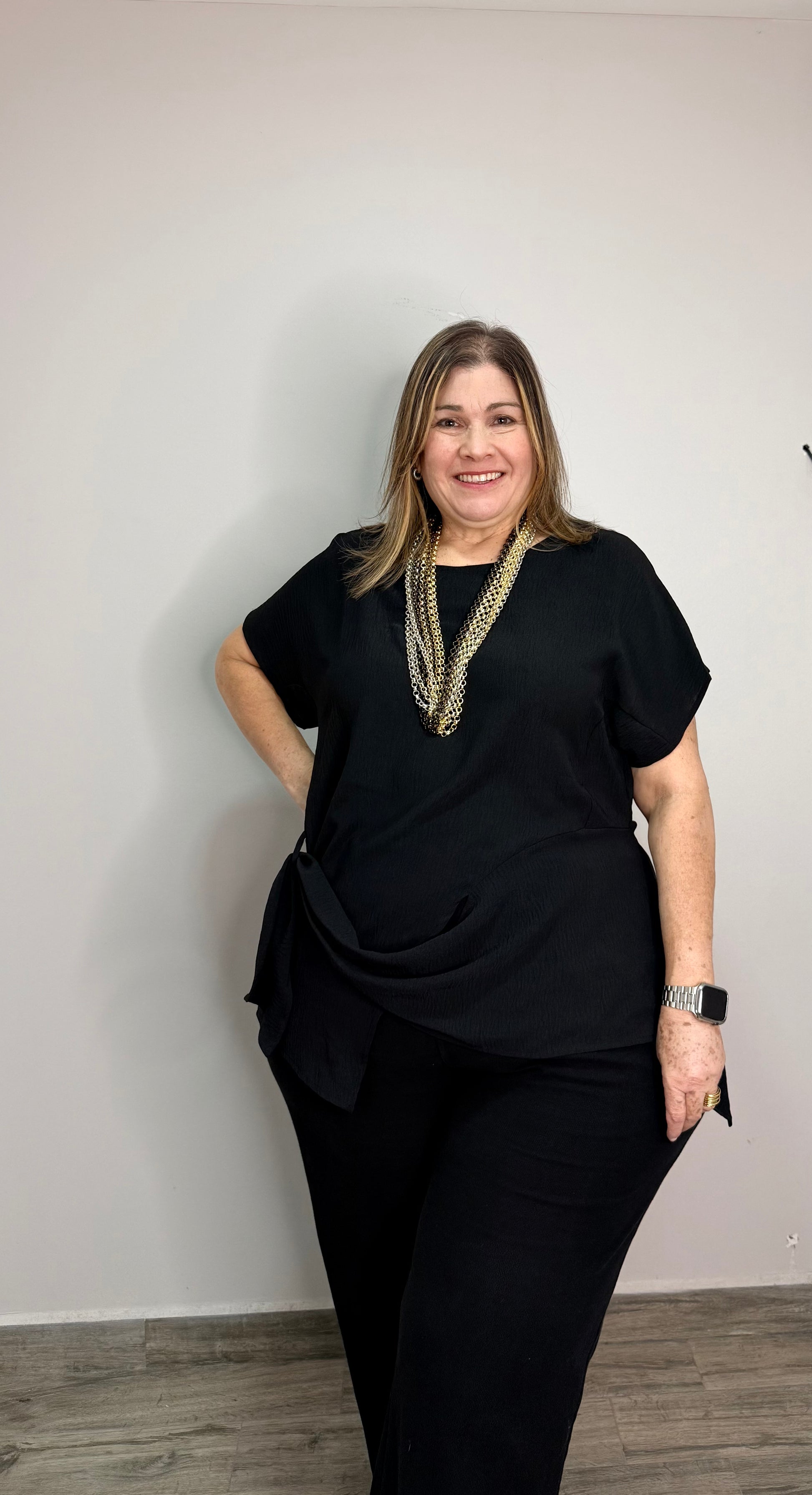 Drop shoulder asymmetrical blouse with loose front side sash detailed. Available in white & black. 100% Polyester.